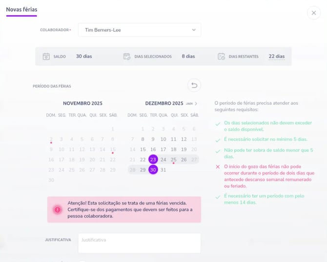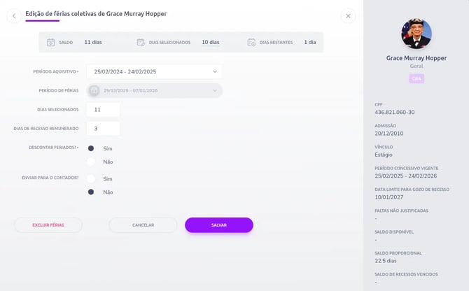 Pode impactar cálculos de saldo de férias