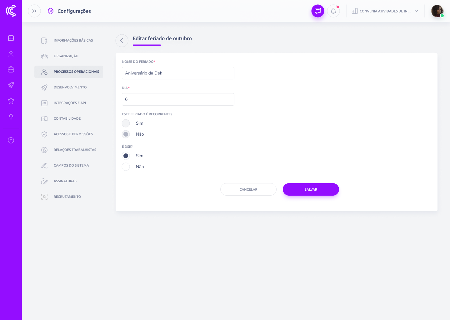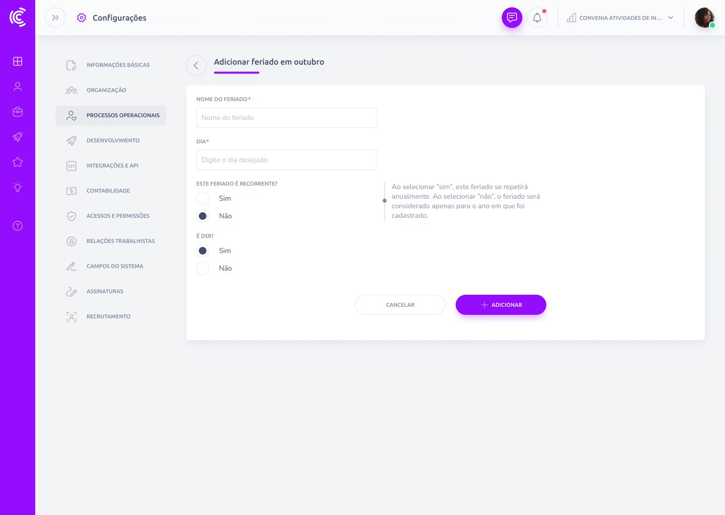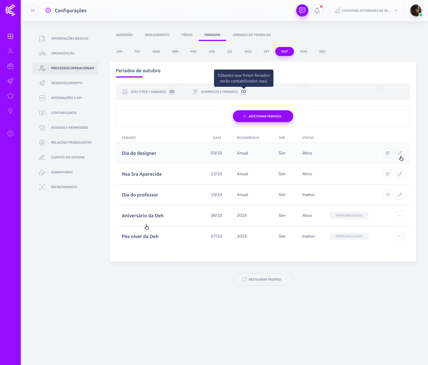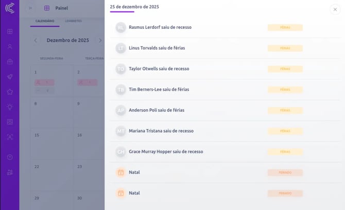 Os feriados configurados refletem automaticamente em várias áreas da Convenia: