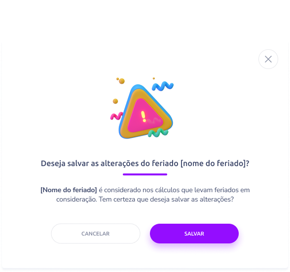 Ao clicar em Salvar o sistema exibirá uma confirmação antes de salvar. Mensagem exibida após a edição: “Feriado editado com sucesso.”
