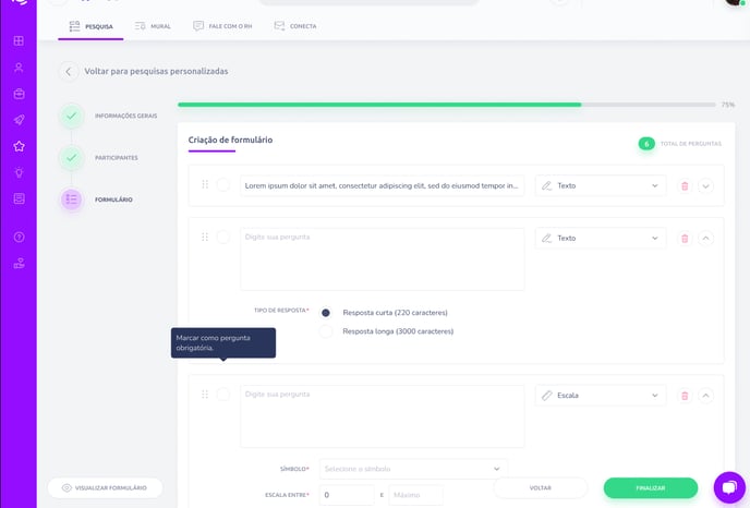 Depois de definir as informações iniciais e os participantes, o próximo passo é montar o formulário da pesquisa ou seja, as perguntas que as pessoas irão responder. Na tela “Formulário da Pesquisa”, você pode adicionar, editar e organizar todas as perguntas que farão parte da pesquisa.