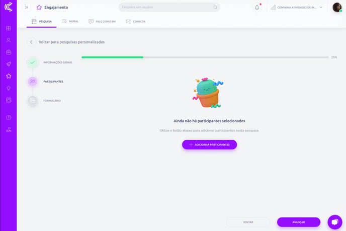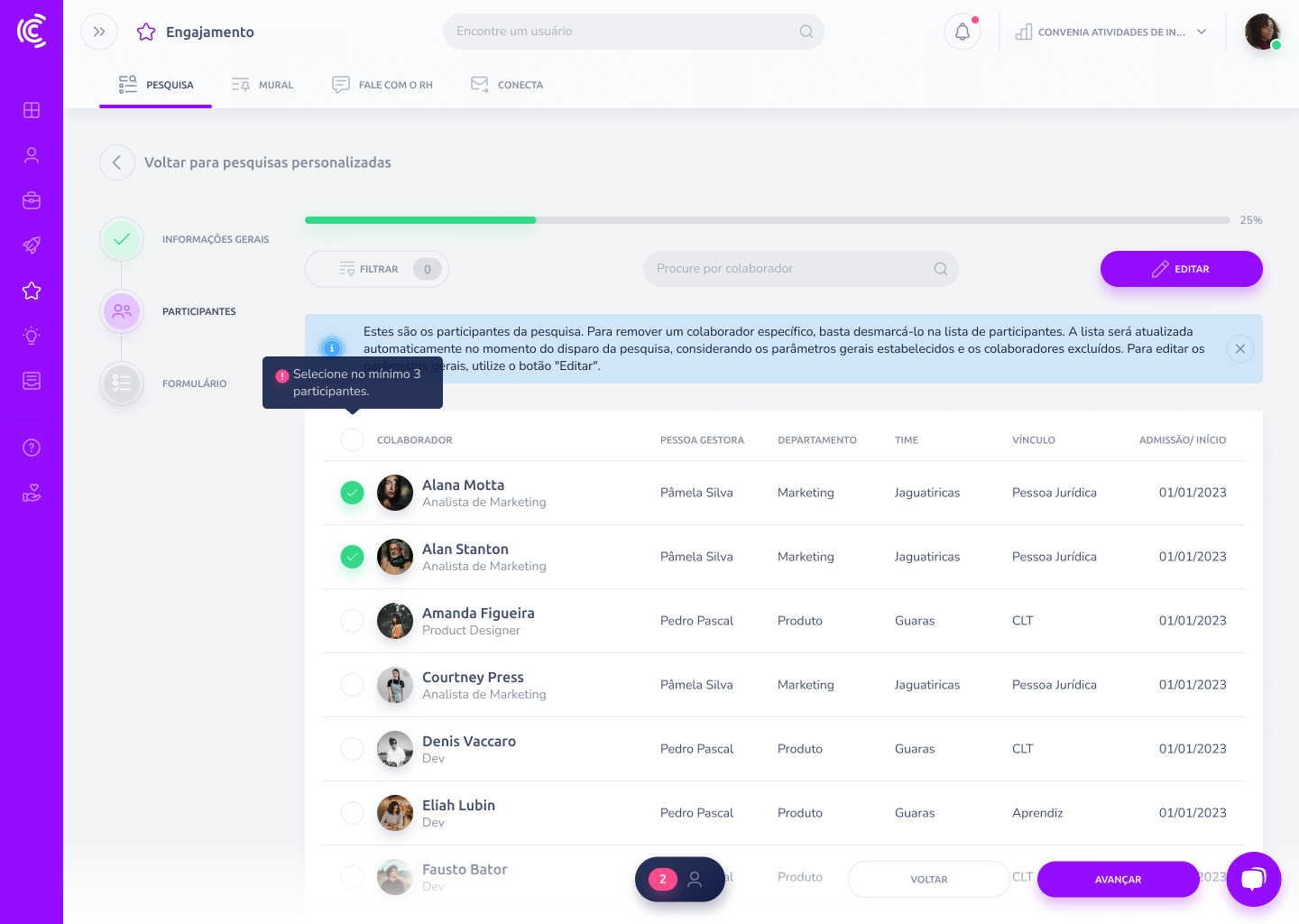 - Em pesquisas anônimas, caso o usuário desmarque todos os participantes ou selecione apenas dois colaboradores, ao tentar avançar será exibido um aviso informando que são necessários no mínimo três participantes para seguir com esse tipo de pesquisa.