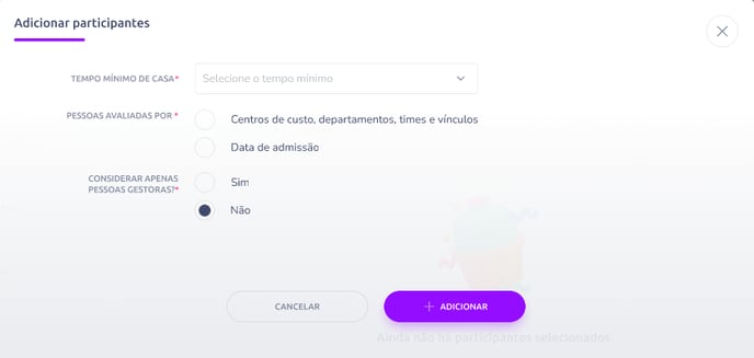 Você poderá segmentar os participantes filtrando por tempo mínimo de casa, centro de custo, departamento, time, vínculo ou data de admissão, além de escolher se deseja incluir apenas pessoas gestoras ou todos os colaboradores.