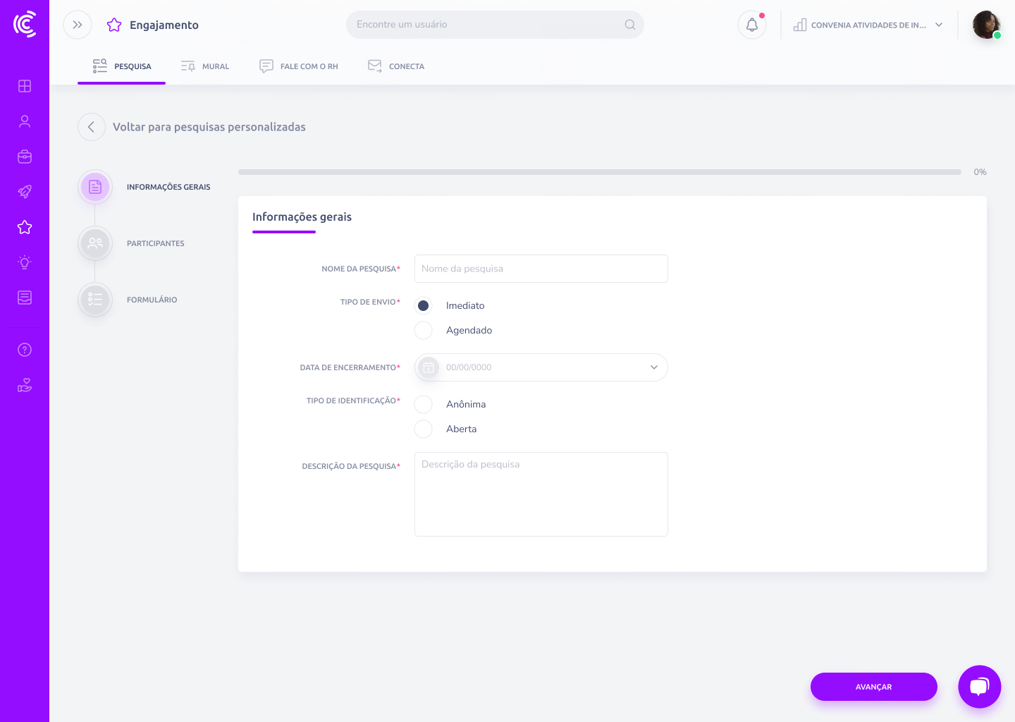 - Nome da pesquisa: defina o título que será apresentado aos colaboradores.