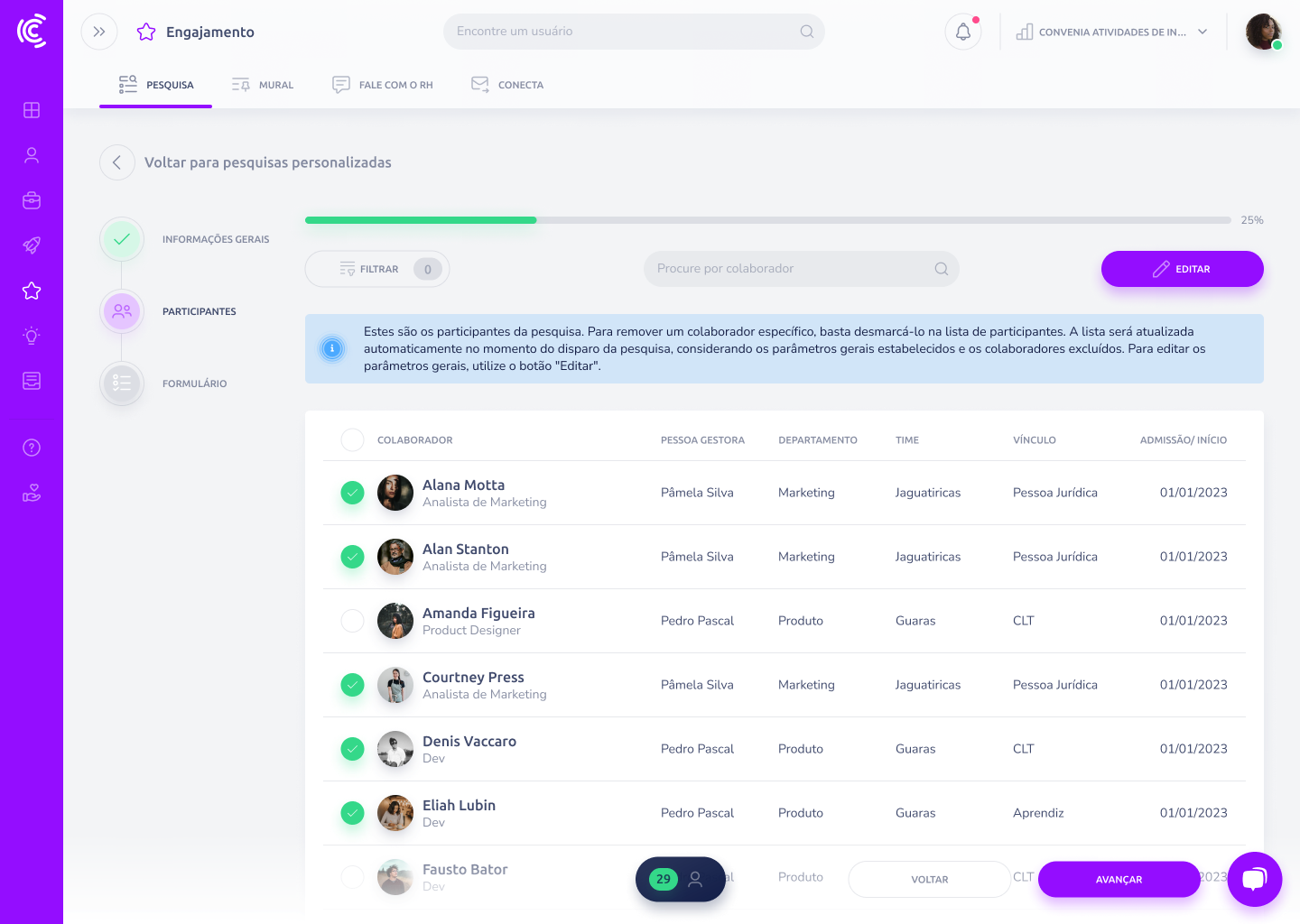 - Colaboradores desmarcados permanecem visíveis na lista, porém não receberão o convite para responder à pesquisa. Ao clicar no check ao lado do título da coluna “Colaboradores”, é possível selecionar ou desmarcar todos da listagem, adotando o mesmo padrão do diretório de colaboradores.