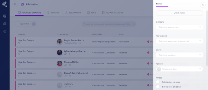 Passo 2) Você pode aproveitar as opções de filtro disponíveis. Utilize a opção "Empresas" para visualizar apenas as empresas que estão acessíveis para você. As opções de filtragem incluem: Empresas, Responsáveis, Status, Períodos e Prazos, além da possibilidade de ordenar as solicitações por urgência: