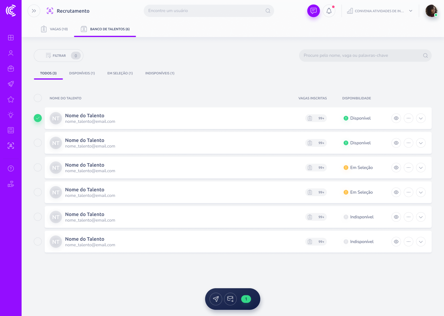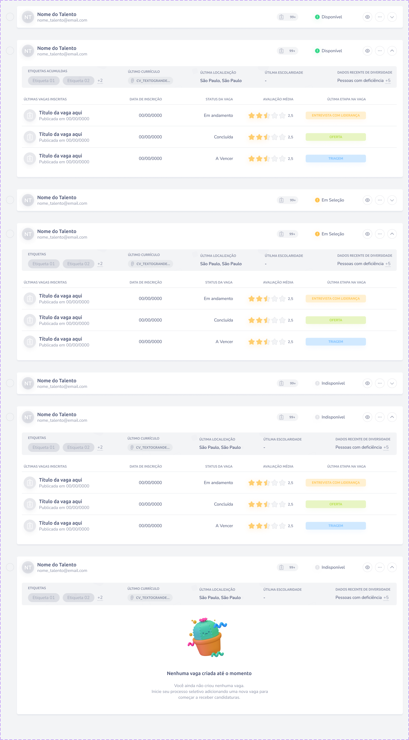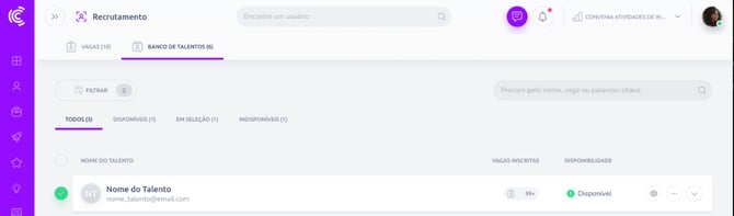 Na visão geral, você verá o nome do talento, o e-mail, a quantidade de vagas em que ele já se inscreveu e o Status de Disponibilidade.