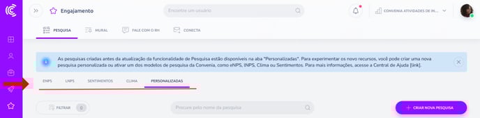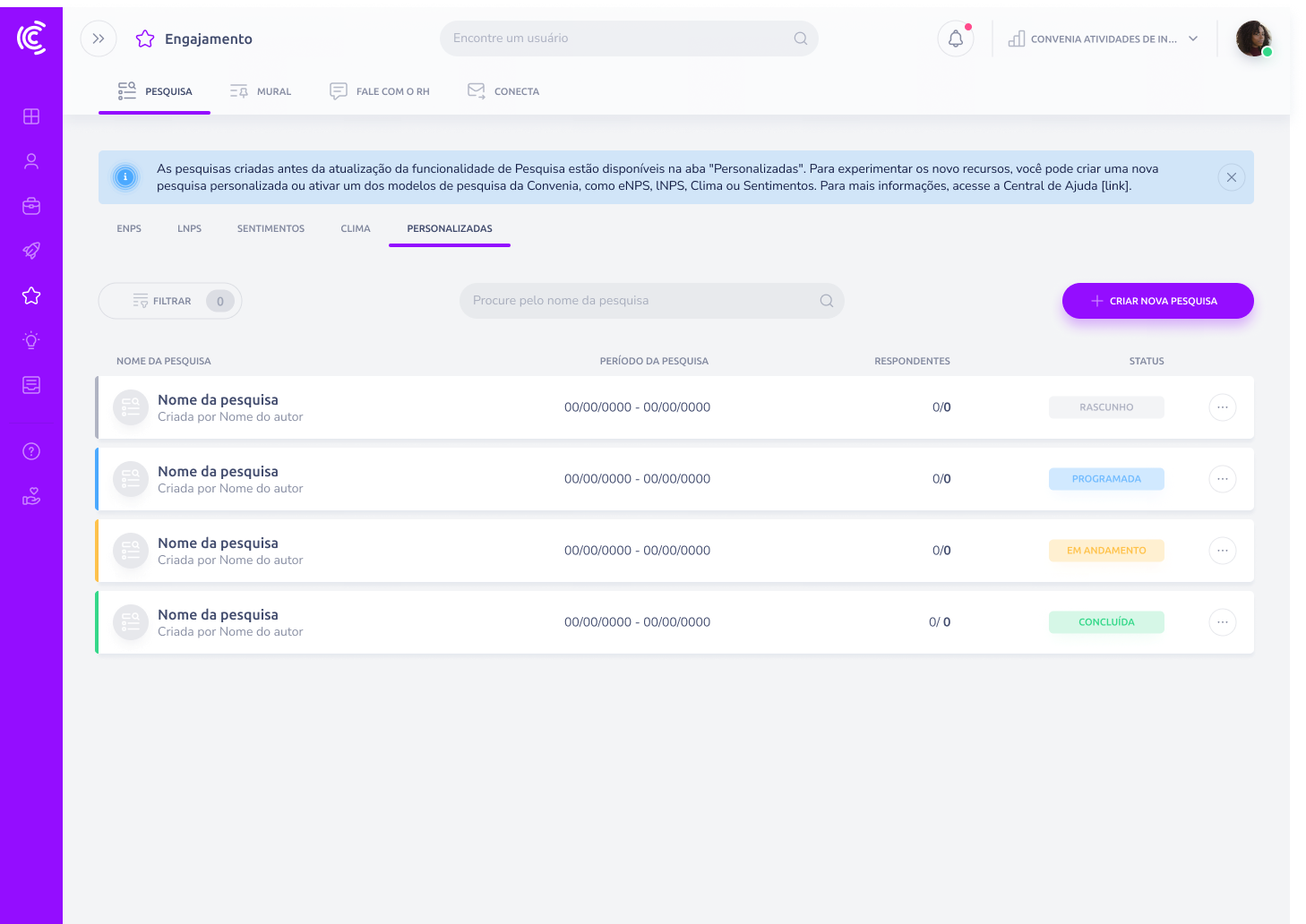 A página de Pesquisas é o espaço onde você pode visualizar, criar e gerenciar todas as pesquisas realizadas na sua empresa.