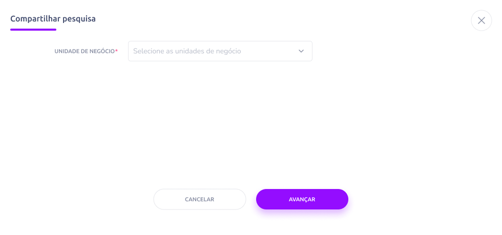 - No campo de seleção (lista suspensa), escolha as unidades de negócio para as quais deseja compartilhar a pesquisa.