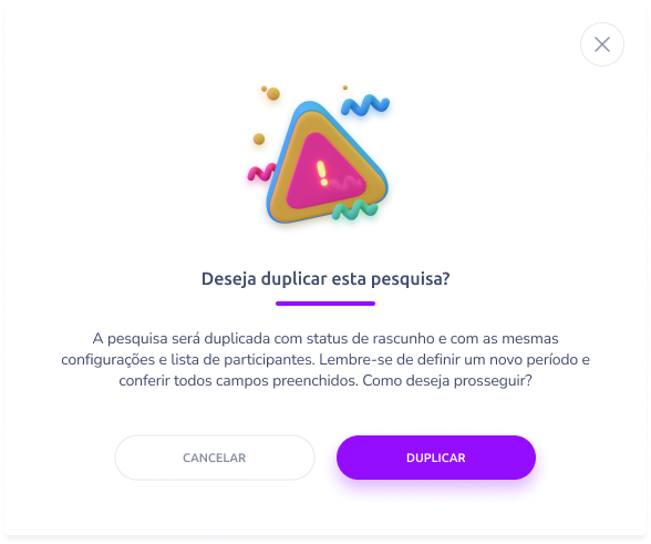 Você pode duplicar qualquer pesquisa personalizada, independentemente do status (rascunho, programada, em andamento ou concluída), para reutilizar seu conteúdo em uma nova pesquisa dentro da mesma unidade de negócio.