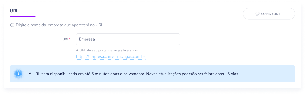 ℹ️ “A URL será disponibilizada em até 5 minutos após o salvamento. Novas atualizações poderão ser feitas após 15 dias.”