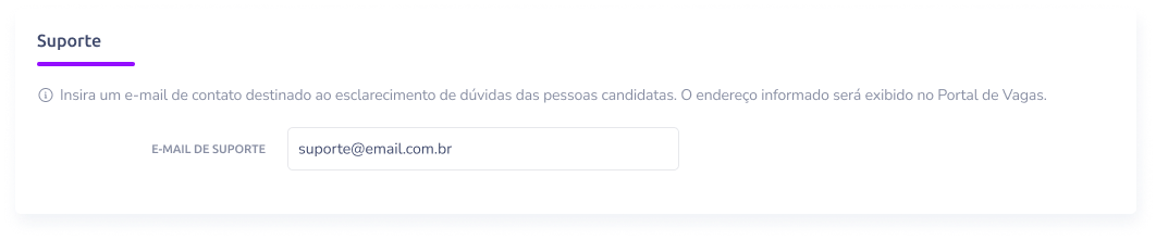 Aqui você informa um e-mail que ficará visível no Portal de Vagas, para que pessoas candidatas possam tirar dúvidas.