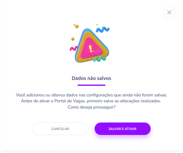 - Se você fizer mudanças e tentar ativar o portal sem salvar antes, aparece uma janela avisando que existem dados não salvos e oferecendo: Cancelar ou Salvar e ativar