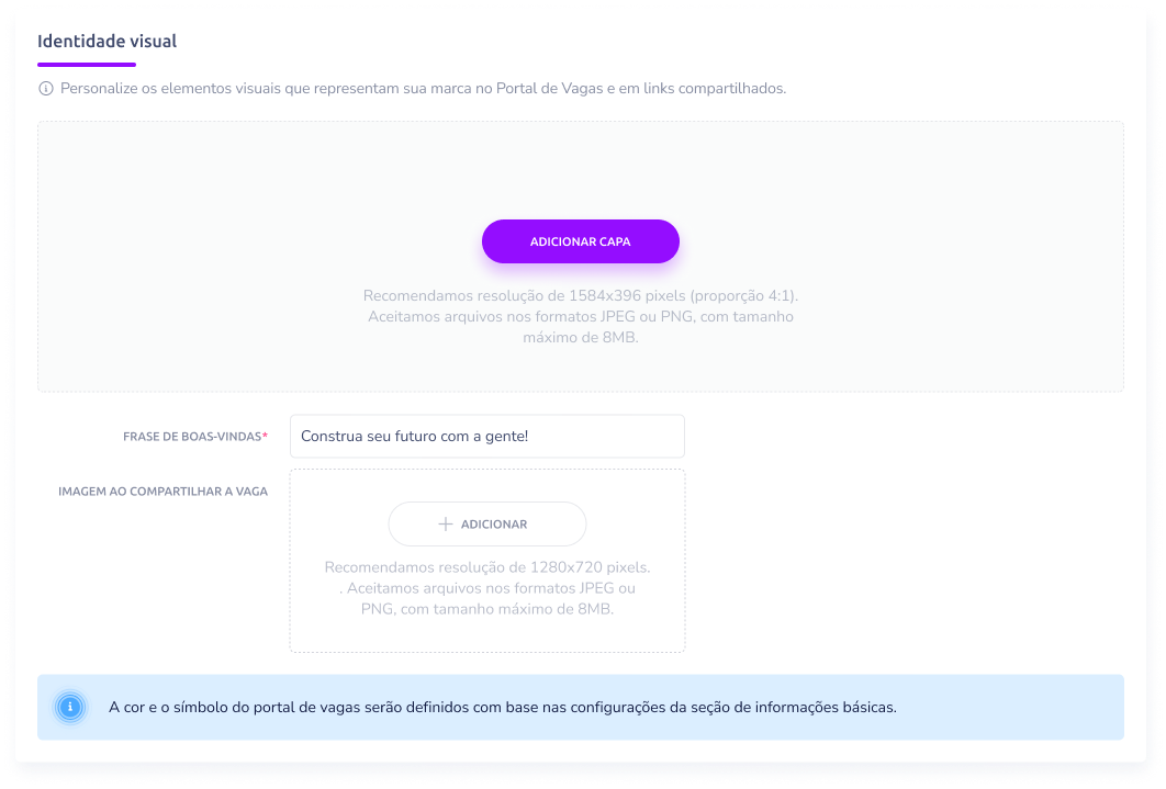 Aqui você personaliza a aparência do Portal de Vagas (capa, frase de boas-vindas e imagem usada em links compartilhados). Personalize os elementos visuais que representam sua marca no Portal de Vagas e em links compartilhados.”