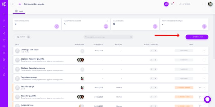 O primeiro passo é acessar a aba de Recrutamento e Seleção da Convenia e clicar em “Adicionar vaga”: