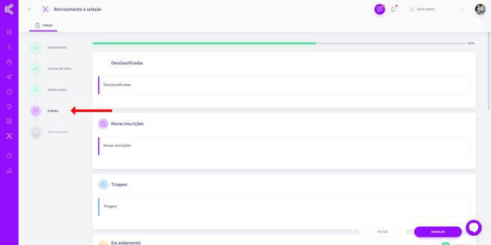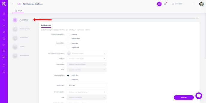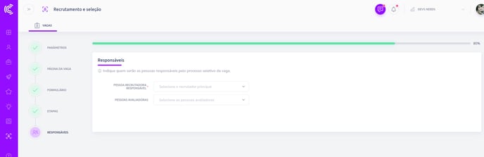 Ao iniciar a criação de uma vaga no módulo de Recrutamento e Seleção da Convenia, você segue um fluxo composto por cinco etapas principais: