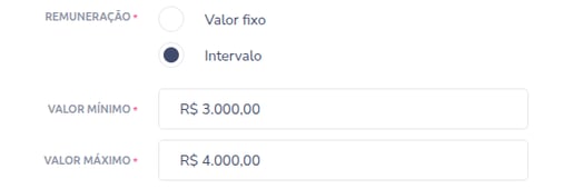 • Remuneração: sendo possível escolher entre valor fixo ou intervalo entre valor minimo e máximo: