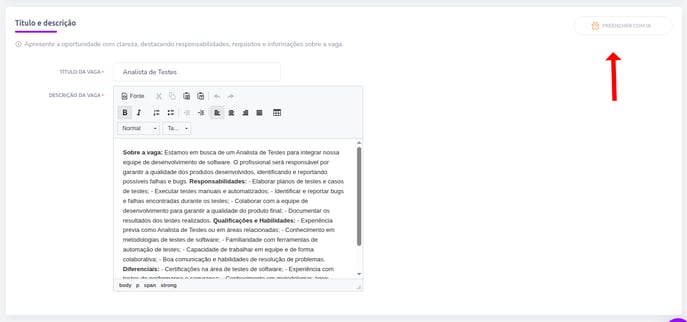 • Descrição da vaga: você pode escrever manualmente ou usar a IA (quando disponível).