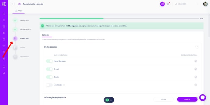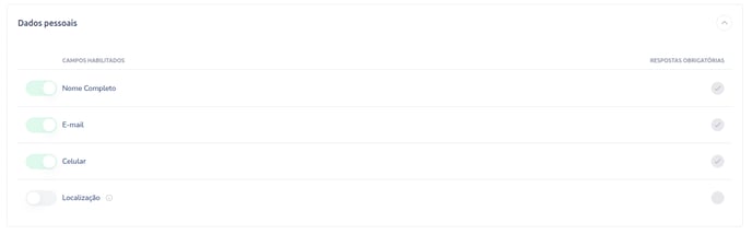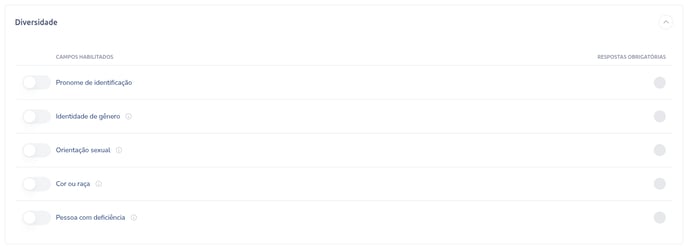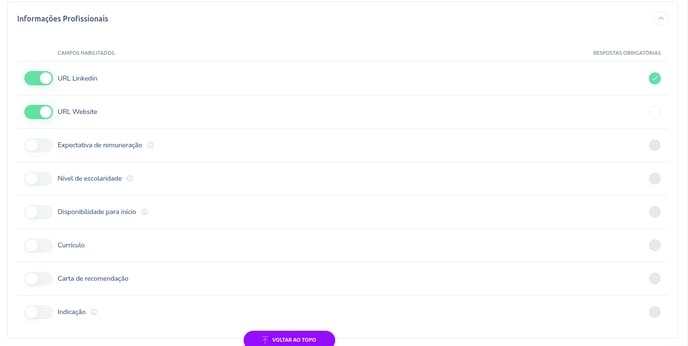 Você tem flexibilidade para escolher quais campos a pessoa candidata deve preencher no início, podendo habilitar ou desabilitar cada campo conforme sua preferência, além de definir se serão obrigatórios ou opcionais. Os campos se dividem em:
