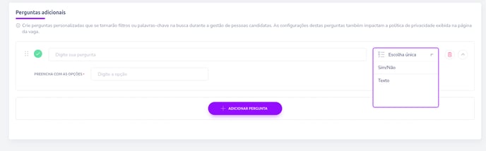 Ao clicar em "Adicionar pergunta", você pode incluir até 5 perguntas extras dos seguintes tipos: