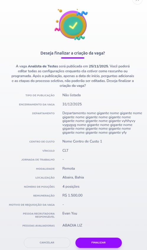 Avaliadores podem visualizar todos os dados da vaga e avaliar candidatos, mas não editar.