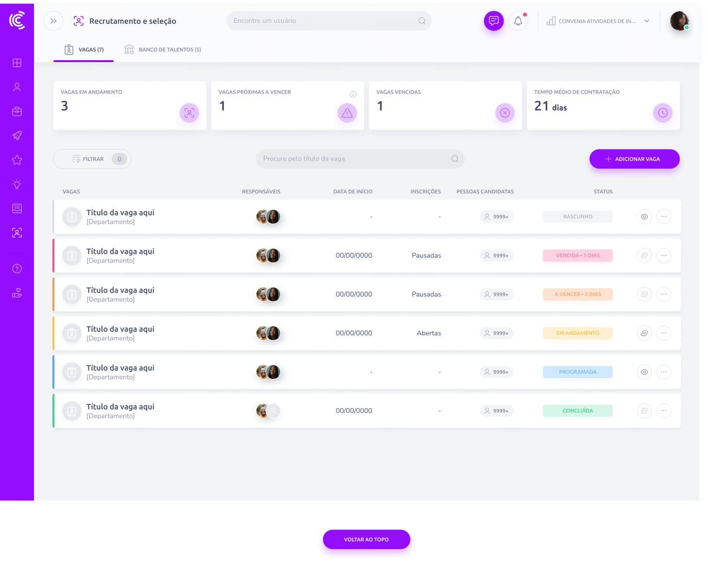 O módulo de Recrutamento da Convenia ajuda você a criar vagas, acompanhar candidatos e gerenciar todo o processo seletivo do início ao fim.