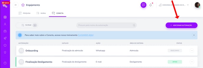 Após confirmar, você será direcionado para a tela inicial de automações, onde aparecerá uma mensagem indicando que a automação foi salva com sucesso e ela ficará visível na lista de automações.