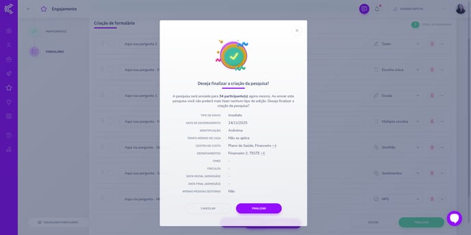 A tela mostrará um resumo com o tipo de envio (Imediato ou Agendado), data de encerramento, tipo de identificação (Anônima ou Aberta), departamentos, times, vínculos e outros filtros selecionados.