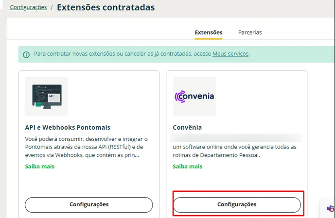 Para realizar a configuração adequada da extensão, siga este guia passo a passo: acesse o menu Configurações, selecione Extensões, depois Configuração de Extensões Contratadas, localize a extensão desejada e clique em Saiba +: